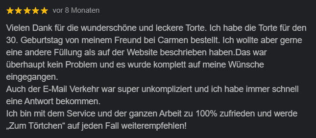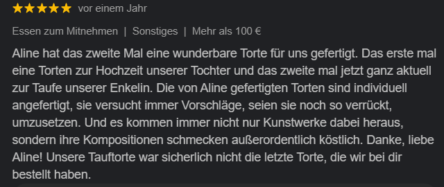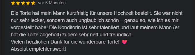 Mit viel Leidenschaft und einem hohen Qualitätsanspruch entstehen hier individuelle Torten, die nicht nur optisch begeistern, sondern auch geschmacklich überzeugen. Verarbeitet werden ausschließlich frische, hochwertige Zutaten – ganz ohne künstliche Aromen oder schwere Standard-Buttercremes.